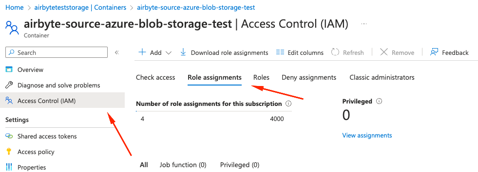 1. Go to Azure portal, select the Storage (or Container) you'd like to sync from and get to Access Control(IAM) -> Role Assignment Access Control (IAM)